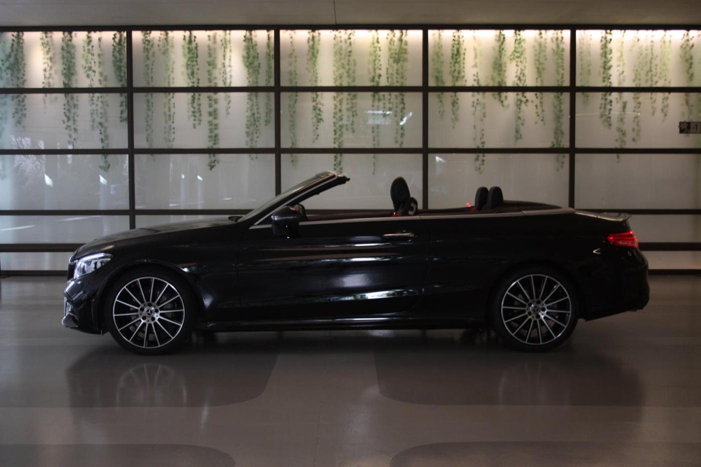 The Mercedes C AMG Cabrio uses an electric fabric soft top that opens and closes in approximately 20 seconds. A fabric roof is lighter than a retractable hardtop, which benefits the car's handling and centre of gravity. When closed, the multi-layer soft top provides good insulation against wind noise and temperature — you can hold a conversation at motorway speeds without raising your voice. The roof can be operated at low speed, so you can drop it at a traffic light or leaving a car park without stopping.
