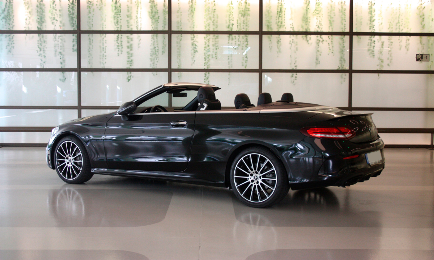 The AMG badge on a C-Class Cabrio is not just cosmetic. It brings a recalibrated chassis, AMG-specific suspension tuning, sport brakes with perforated 350 mm front discs, and a body kit that lowers the visual centre of gravity. The result is a car that looks planted and muscular from every angle. On Ibiza, where first impressions are currency, that matters.