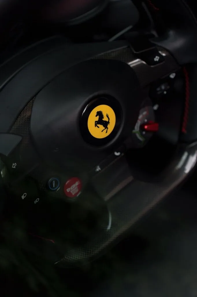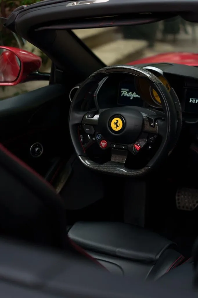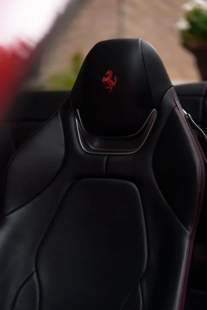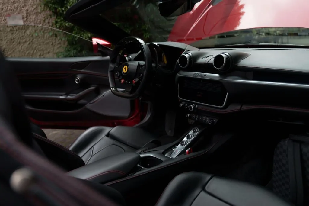 Couples are the core audience. The front seats are pure Ferrari — hand-stitched leather, carbon fibre accents, the Manettino at your fingertips. The 2+2 rear seats work for short transfers or extra luggage. A weekend bag, a beach tote, a shopping haul from Ibiza Town — the 292-litre boot handles it with the roof up or down.