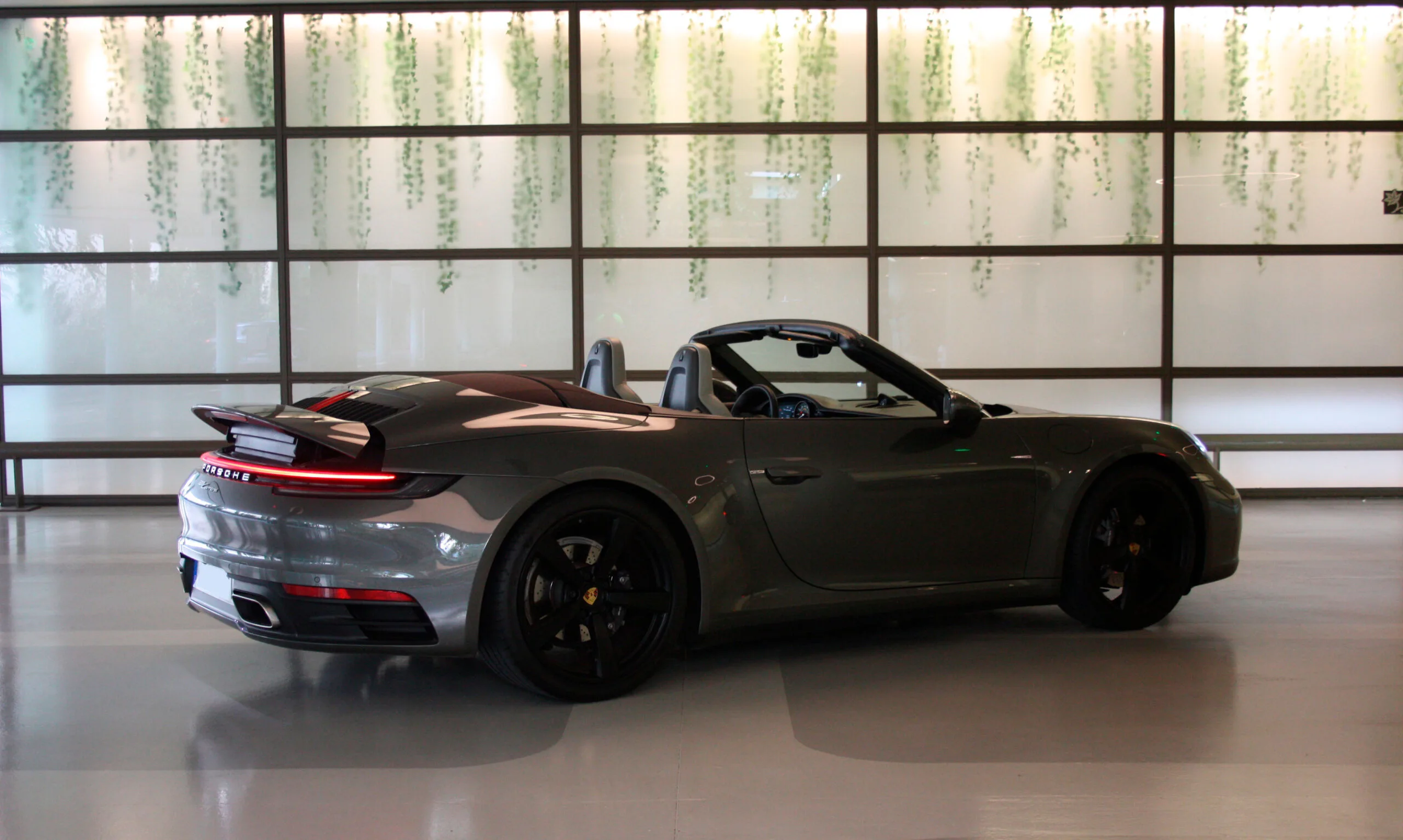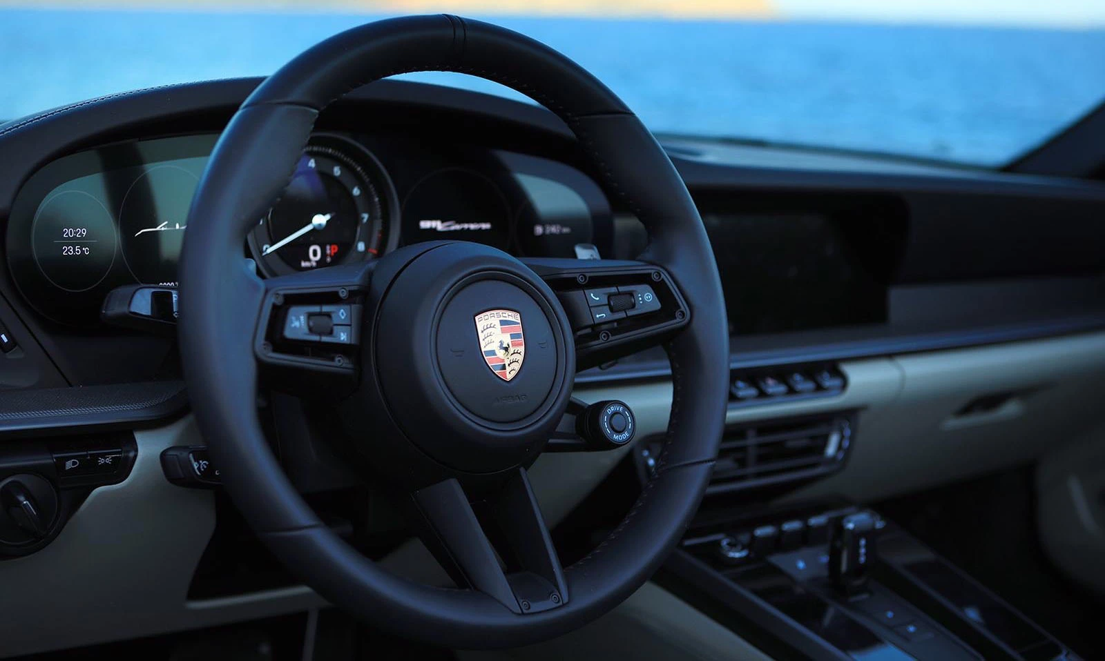 Then there is the roof. It opens and closes at up to 50 km/h — one button, twelve seconds, done. Suddenly the warm evening air fills the cabin, the flat-six hums behind you, and the sunset over Es Vedrà is not something you see. It is something you feel on your skin.