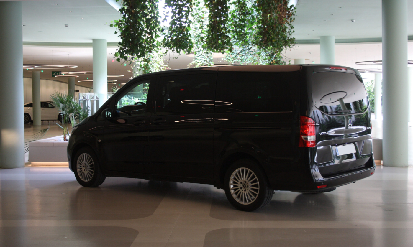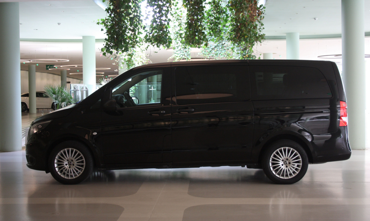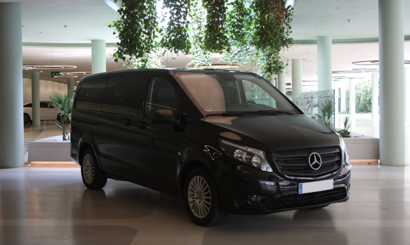 Six to nine people land at Ibiza Airport. Eight suitcases, carry-ons, a couple of golf bags. In two taxis, the luggage barely fits and the group splits. In the Vito, everyone boards through the sliding doors, luggage goes in the 1,390-litre boot, and you drive directly to the villa as one group. The 9G-TRONIC automatic handles the airport traffic without effort. Multi-zone climate control cools every row. Thirty minutes later you arrive together, relaxed.