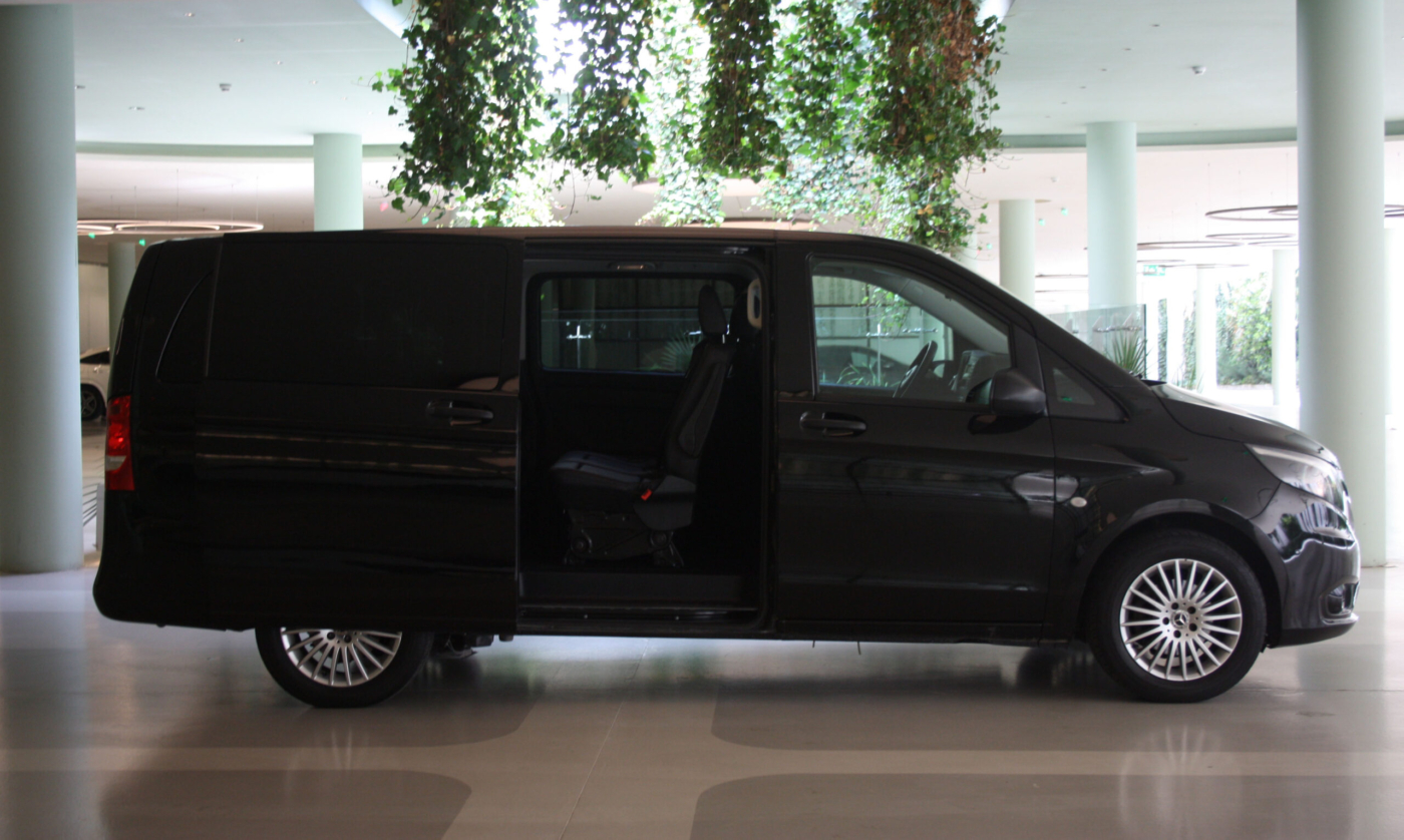 The Mercedes Vito Tourer is available in Long (L2) configuration in the fleet, measuring 5,140 mm bumper to bumper. That length accommodates three full rows of seating with generous legroom in every position. Behind the third row, the boot still holds multiple full-size suitcases. The sliding side doors on both flanks make boarding easy even in tight parking spaces — a detail that matters at busy beach car parks and narrow villa driveways.